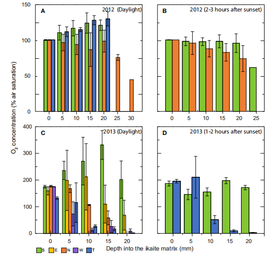 圖4、條形圖顯示測量伊卡石基質(zhì)深度增加時的原位氧氣濃度剖面(以%空氣飽和度表示)。數(shù)據(jù)來自兩個野外實驗:(A,B)2012年和(C,D)2013年。圖表顯示白天測量(A,C)和日落后1-3小時的測量(B,D)。顏色表示在伊卡石鈣華柱上的測量位置;S=南,E=東,N=北,W=西,T=頂部。均值±標準誤(n=3-25);沒有誤差條的柱形圖n<3。復(fù)制品數(shù)量的廣泛跨度是由于各種因素(例如水流、寒冷暴露、疲勞)使得潛水員在某些方向上難以在較長時間內(nèi)保持穩(wěn)定。