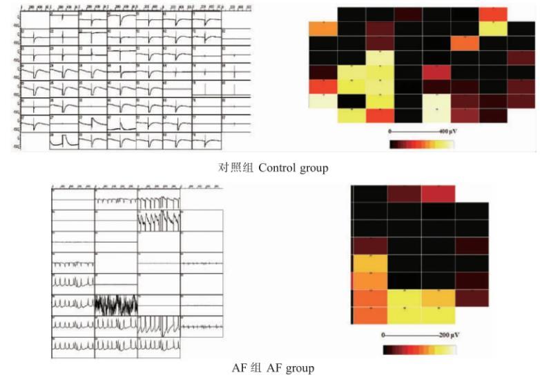 無論是對照組還是AF組均為RAA比LAA電壓高,且AF組LAA和RAA的電壓較對照組明顯降低。鑒于在體時右耳的解剖位置靠右、后、上,右房右耳較早除極,心臟整體的除極方向和其自身除極的方向一致,在心電向量圖上也表現為環體向前向下,而在心電圖的機理上也有右房大表現為P波的電壓增高,說明右房大小和P波呈正相關。而LAA除極方向幾乎和除極方向垂直,故其更大程度表現為時限,而不表現為電壓。正常左房除極向量方向是指向左后偏下,LAA為左右心房最終除極的部位,而心臟的整體除極方向為左前下,LAA更多反映心房最終除極時限,因此在對照組犬的LAA比RAA電壓小。而在48 h AF組,由于高右房局灶激動,形成折返,造成左右房顫動樣傳導,由于每個單個的折返環小,電壓低,且方向不一,在同一個方向上形成大的合力,故造成AF組LAA和RAA的較對照組電壓降低。