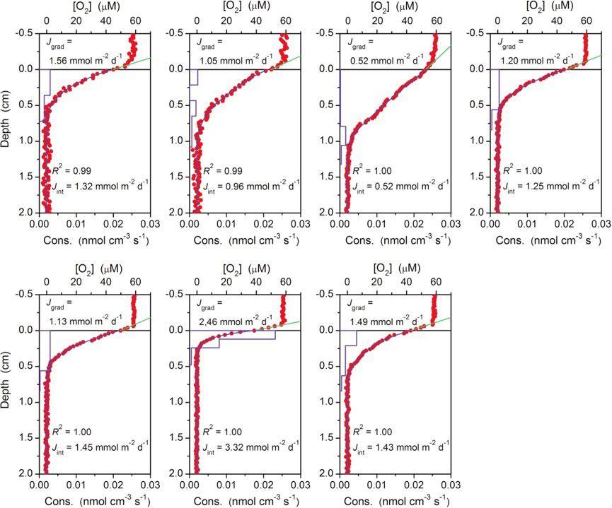 圖4、七個代表性的O2微剖面(點),穿透深度從0.26到1.20厘米不等。擴散邊界層中的梯度(綠線)用于估算O2通量。使用PROFILE剖面解釋軟件產生剖面擬合(藍線)、O2消耗率作為深度函數(藍色階梯曲線)和替代通量估計。在這7個剖面中,兩種擬合方法的均值一致,誤差不超過8%。