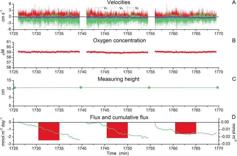 圖2、三個連續的13.5分鐘爆發的渦旋相關數據。(A)原始8赫茲速度數據(x、y、z)。可見的高頻噪聲源于底部水域中的低粒子濃度。(B)原始8赫茲O2濃度數據。(C)ADV記錄的每個爆發開始和結束時沉積物表面上方的速度和O2濃度的測量高度。(D)每個爆發的推導O2通量(柱形)和相關的累積通量(線)。