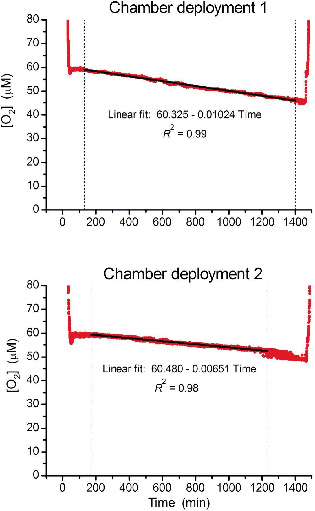 圖3、海底室中測量到的O2濃度(點),在其最終下降到海底時,當ROV水平移動時,實際孵育期間以及初始恢復期間測量。涵蓋了21.1和17.6小時周期的線性擬合(線)被用于通量提取。