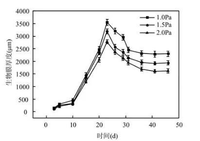 在不同的水力條件下,生物膜厚度的變化都有著相似的規(guī)律.首先,生物膜厚度的增長(zhǎng)在15~25d內(nèi)達(dá)到最大值,表明在這一階段生物膜的生長(zhǎng)速率大于脫落速率.在厚度達(dá)到最大之后的5~10d左右,由于生物膜厚度的生長(zhǎng),使得脫落速率不斷增大而大于生長(zhǎng)速率,因而生物膜厚度出現(xiàn)了一定程度的減小.最終,當(dāng)生物膜的生長(zhǎng)速率與脫落速率逐漸達(dá)到平衡,生物膜的厚度也趨于穩(wěn)定.在本實(shí)驗(yàn)條件下,1.0,1.5,2.0Pa 3種水力條件下對(duì)應(yīng)的生物膜厚度分別為(2.3±0.1),(1.9±0.1),(1.6±0.1)mm。