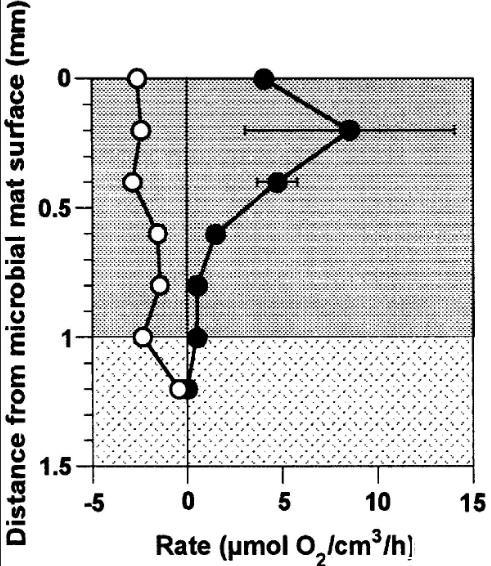 圖5、在點(diǎn)1的沉積物中的平均總光合速率(填充圓圈)和計(jì)算得到的O2呼吸速率(開放圓圈)的剖面,在1900 mmol photons/m2/s的光強(qiáng)度下。誤差條代表測(cè)量的標(biāo)準(zhǔn)偏差。正值和負(fù)值分別表示O2產(chǎn)生和O2呼吸速率。微生物墊表面在深度為0毫米處。微生物墊和沉積物分別用灰色區(qū)域和虛線區(qū)域表示。