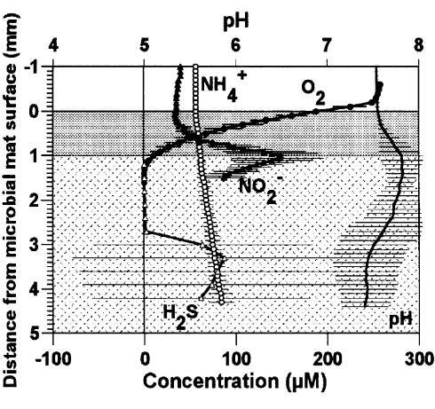 圖3、在點(diǎn)1的沉積物中的O2、NH4+、NO2、H2S和pH的平均穩(wěn)態(tài)濃度剖面。O2濃度是在10 mmol-photons/m2/s的光強(qiáng)度下測(cè)量的。誤差條代表測(cè)量的標(biāo)準(zhǔn)偏差。微生物墊表面在深度為0毫米處。微生物墊和沉積物分別用灰色區(qū)域和虛線區(qū)域表示。