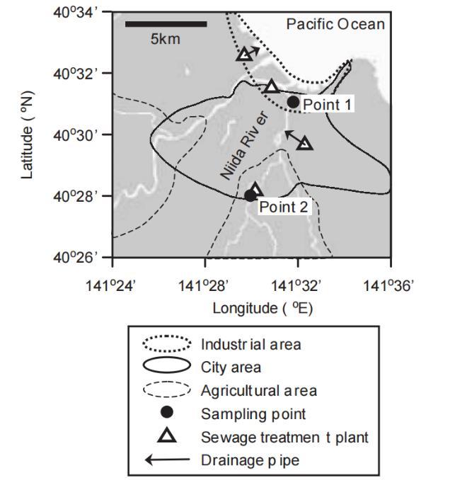 圖1、顯示了日本八戶市新井田河中采樣點(diǎn)(點(diǎn)1和點(diǎn)2)的地圖。