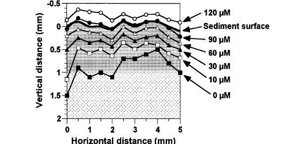 圖2、在點(diǎn)1的沉積物中的垂直截面中O2濃度的代表性二維等值圖。O2濃度是在10 mmol-photons/m2/s的光強(qiáng)度下測(cè)量的。右邊邊緣的數(shù)字表示O2濃度。通過(guò)顯微觀察確定的微生物墊表面用一條線表示。微生物墊和沉積物分別用灰色區(qū)域和虛線區(qū)域表示。