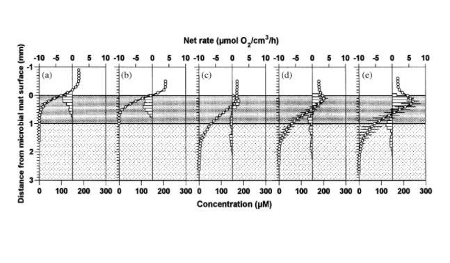圖4、在點(diǎn)1的沉積物中的平均穩(wěn)態(tài)O2濃度剖面(開放圓圈)和計(jì)算得到的凈氧產(chǎn)生和消耗速率(柱狀圖)。O2濃度是在10(A)、400(B)、1050(C)、1550(D)和1900(E)mmol photons/m2/s的光強(qiáng)度下測(cè)量的。誤差條代表測(cè)量的標(biāo)準(zhǔn)偏差。正值和負(fù)值分別表示氧氣產(chǎn)生和消耗速率。微生物墊表面在深度為0毫米處。微生物墊和沉積物分別用灰色區(qū)域和虛線區(qū)域表示。