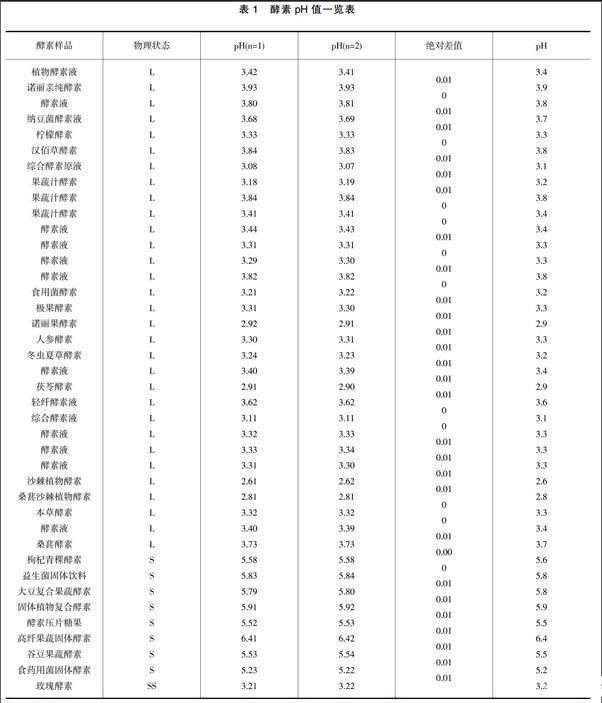 從以上40種酵素的檢測結果可以看出:液態酵素產品的pH均在3~4之間,固態酵素產品pH均在5左右,半固態酵素pH在3左右(半固態酵素市場占有率低),所有酵素樣品兩次平行測定的PH的絕對差值均小于0.02,該方法重現性較好。