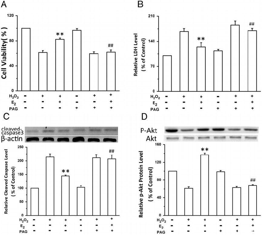 圖1、CSE抑制劑減弱E2介導的原代培養新生大鼠心肌細胞氧化應激保護作用。在無CSE抑制劑(PAG,1mmol/L)或有CSE抑制劑存在的情況下,用E2(10nmol/L)培養細胞24小時。然后將細胞暴露于H2O2(200μmol/L)中4小時。通過MTT(A)和上清液LDH濃度(B)評估細胞的整體存活率。通過Western blot分析確定裂解的Caspase-3(C)和磷酸化的Akt(D)水平。