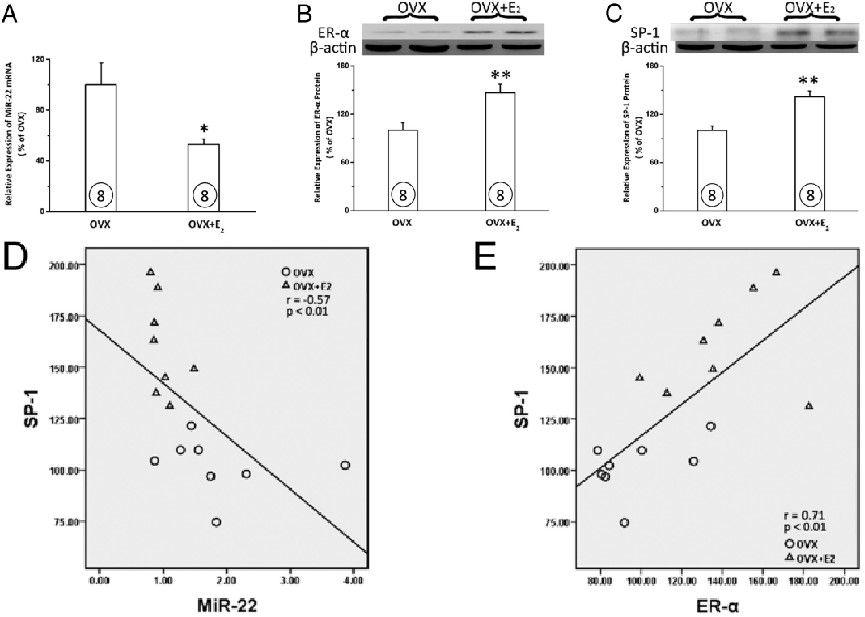 圖5、E2療法對卵巢切除大鼠心肌中miR22、ERα和Sp-1表達的影響。對雌性大鼠進行雙側卵巢切除術,以消耗內源性雌激素。外源性E2給藥8周。定量實時RT-PCR和Western印跡分析分別用于測定miR-22的表達(A)以及ERα和Sp-1的蛋白表達(B)。條形圖內的圓圈表示每組的人數。所有條形圖均代表平均±SEM,代表性的Western印跡條帶位于相應圖的頂部。D,用線性回歸法分析miR-22與Sp-1水平的相關性。E,線性回歸法分析ERα與Sp-1水平的相關性。