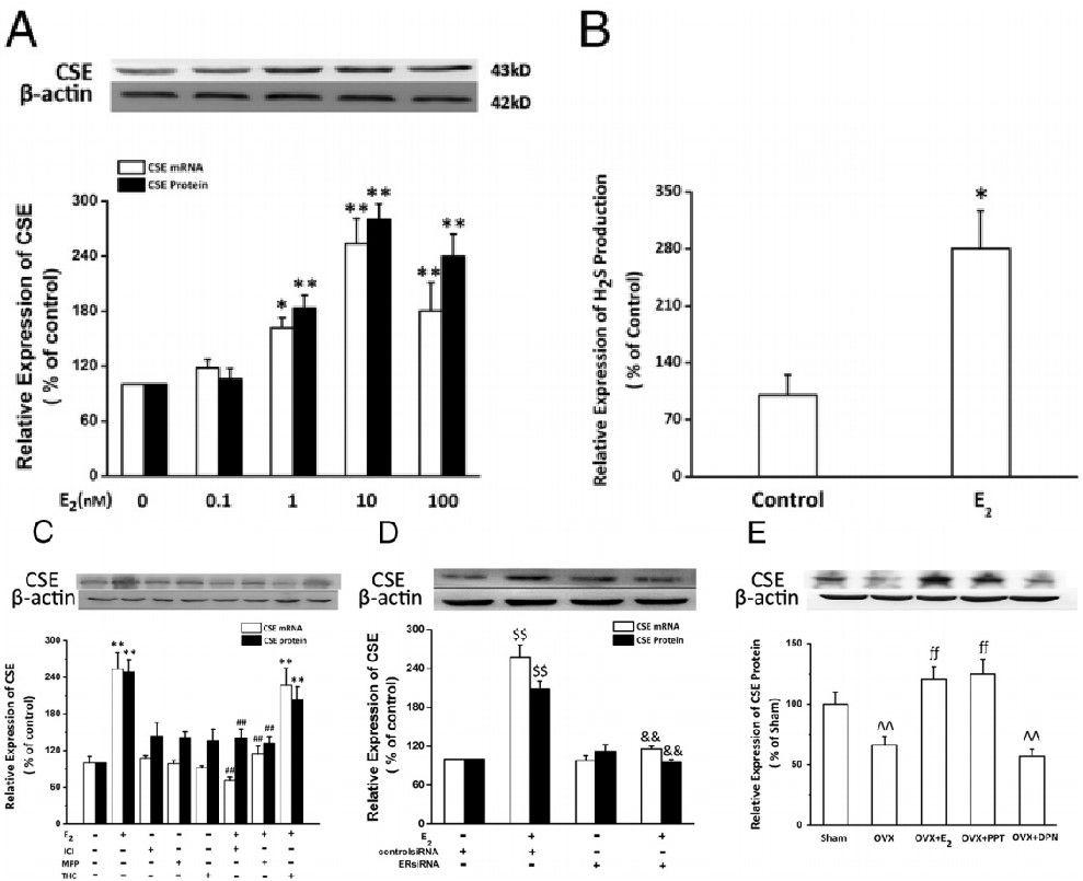 圖3、E2在原代培養的新生心肌細胞中介導E2對CSE表達的調節。A,用指定劑量的E2刺激細胞24小時。采用定量實時RT-PCR和Western印跡分析分別測定心肌細胞(n=4)中CSE mRNA和蛋白的表達。B,用E2(10nmol/L)刺激細胞24小時。實時硫化氫生成測量用于確定硫化氫生成率,如材料和方法中所述(n=3)。C,在無或有非特異性ER拮抗劑ICI 182780(1μmol/L)、ERα特異性拮抗劑MPP(1μmol/L)或ERβ特異性拮抗劑THC(1μmol/L)的情況下,用E2(10nmol/L)處理細胞24小時。定量實時RT-PCR和Western印跡分析分別用于測定心肌細胞(n=4)中CSE mRNA表達和蛋白表達。D,用對照siRNA或ERαsiRNA轉染細胞24小時,然后用E2(10nmol/L)處理24小時。采用實時RT-PCR定量分析和Western印跡分析分別測定心肌細胞中CSE mRNA表達和蛋白表達(n=4)。E,對雌性小鼠進行雙側卵巢切除術以清除內源性雌激素。外源性E2和ERα選擇性激動劑(PPT)和ERβ選擇性激動劑(DPN)均持續給藥4周。采用Western印跡分析測定心肌中CSE蛋白的表達(每組8人)。