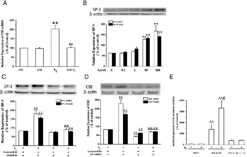 圖4、Sp-1在大鼠心肌細胞中介導E2對CSE的上調。A,蛋白合成抑制劑(CHX)對E2誘導的CSE mRNA表達的影響。用CHX(10μmol/L)預處理原代培養的新生心肌細胞1小時,然后用E2(10nmol/L)刺激24小時。通過實時RT-PCR定量評估CSE mRNA的穩態水平。B、E2對Sp-1表達的影響。用指定劑量的E2處理原代培養的新生兒心肌細胞24小時。定量實時RT-PCR和Western印跡分析分別用于檢測Sp-1mRNA表達和蛋白表達。C,ERα介導E2誘導的Sp-1表達。用對照siRNA或ERαsiRNA轉染原代培養的新生兒心肌細胞24小時,然后用E2(10nmol/L)處理24小時。D,Sp-1在E2上調CSE表達中的作用。用對照siRNA或Sp-1 siRNA轉染原代培養的新生兒心肌細胞,然后用E2(10nmol/L)處理24小時。E,E2對大鼠CSE啟動子活性的影響。用大鼠CSE啟動子-熒光素酶報告構建體pGL3-CSE或突變構建體pGL3-CSE SP1轉染H9c2細胞,然后暴露于E2 24小時。使用雙熒光素酶報告實驗分析啟動子活性。實時定量RT-PCR和Western印跡分析分別用于測定CSE或Sp-1 mRNA表達和心肌細胞蛋白表達(n=4)。