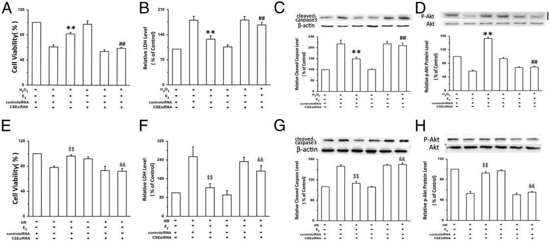 圖2、CSE siRNA可減弱E2-介導的原代培養新生大鼠心肌細胞氧化應激保護作用。用對照siRNA或CSE siRNA預處理細胞24小時,然后用或不用E2(10nmol/L)孵育24小時。A-D,然后將細胞暴露于H2O2(200μmol/L)4小時。E-H,然后將細胞放入厭氧室,用92%N2、5%CO2和3%O2凈化24小時,然后復氧2小時。通過MTT(圖A和E)和上清液LDH濃度(圖B和F)評估整體細胞活力。通過Western印跡法測定裂解的Caspase-3(圖C和圖G)和磷酸化的Akt(圖D和圖H)水平。