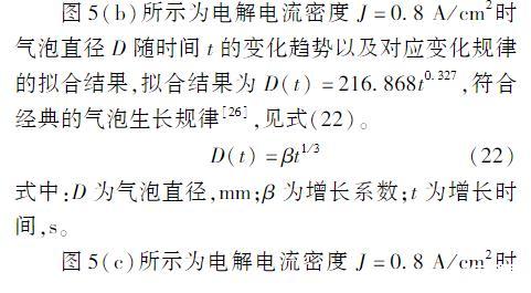 根據(jù)電解過程的電化學(xué)理論可知,隨著電流密度的提高,單位時間內(nèi)電極表面提供氫的速率也隨之增大。這導(dǎo)致氣液界面的平均過飽和濃度差增大,進(jìn)而加快了液相氫組分向氣泡內(nèi)部傳質(zhì)的速率。因此,氣泡的增長明顯加快,在同樣的氣泡生長時間里,氣泡的直徑也增大。當(dāng)電流密度不變時,氣泡在初始生長階段的氣液界面上平均過飽和濃度差較大,因此,氣泡的生長速度也會不同。隨著氫組分不斷擴(kuò)散到電解液中,氣液界面上的平均過飽和濃度差會逐漸減小,從而導(dǎo)致氣泡的生長速度逐漸減小。