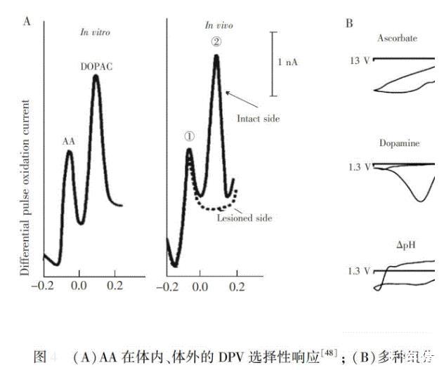 Adams等于1972年第一次將碳糊電極(直徑約300μm)植入大鼠腦內,并獲得了腦內第一張循環伏安圖,并猜測所獲得的伏安信號為AA的氧化峰。用同樣的方法,O'Neill等通過腦區微注射和腹腔注射AA,增加了伏安信號,Brazell等通過向腦區注射AA選擇性氧化酶(Ascorbate oxidase,AAOx),證實了獲得的伏安信號為AA,并用該方法測定了不同腦區和微注射谷氨酸時AA的變化。然而,碳糊電極直徑太大,碳纖維電極(CFE,5~7μm)具有較高空間分辨率和生物兼容性等性能,因此,越來越多研究開始關注CFE,并發展了許多檢測AA的方法。Gonon等第一次對CFE進行處理,用DPV法實現了腦內AA的選擇性分析。Heien等通過快速掃描循環伏安法(Fast scan cyclic voltammetry,FSCV)和主成分回歸分析對FSCV數據進行了多組分分析,可同時測定AA、5 HT、DA、DOPAC、pH值的實時變化(。