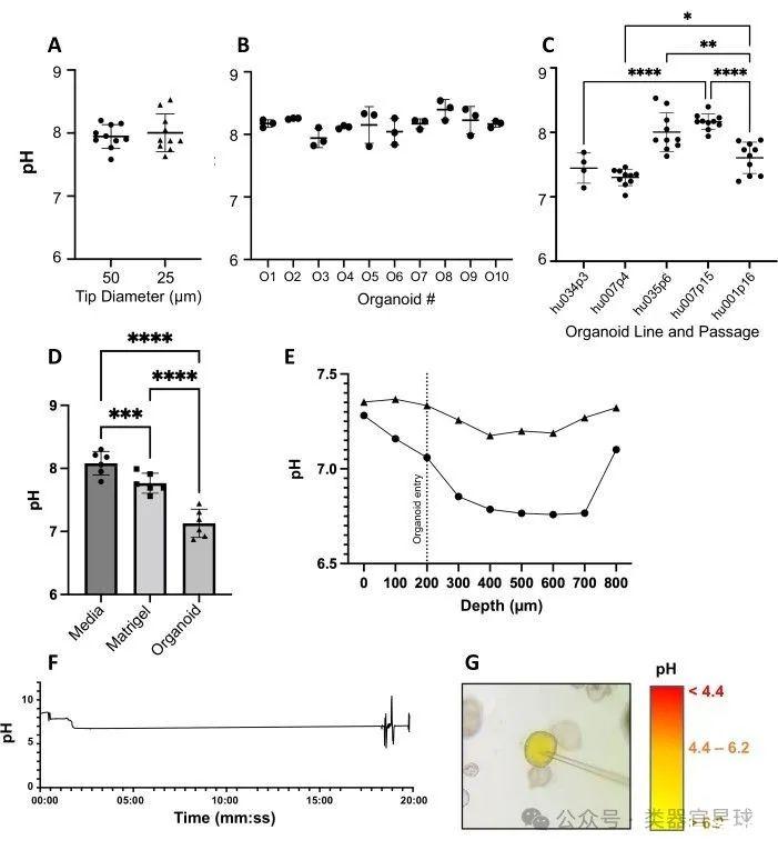 研究者們使用了微操縱器控制的微電極來精確測量3D人類胃類器官腔內的pH值,這種方法提供了對腔內生理特性的時空特征進行細致分析的能力。