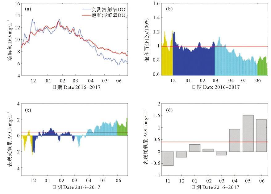 圖2觀測期間的DO(mg/L)、DOS(mg/L)、p(b)、日平均AOU(c,mg/L)和月平均AOU(d,mg/L)時間序列;((b)和(c)中從左至右的四種顏色分別表示秋季、冬季、春季和夏季;(b)中紅色線表示飽和百分比為100%;(c)和(d)中紅色線表示平均值。
