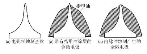 Woo等制備納米盤電極是通過電化學(xué)蝕刻微絲制作的,將除頂點(diǎn)以外的部位用指甲油覆蓋,然后用40 ns的脈沖來切割頂端,如圖2所示。掃描電鏡圖像顯示,隨著脈沖蝕刻的增加,電極尖點(diǎn)尺寸減小,表面變平,由于其具有明確的形狀,此微電極具有更好的電化學(xué)性能。
