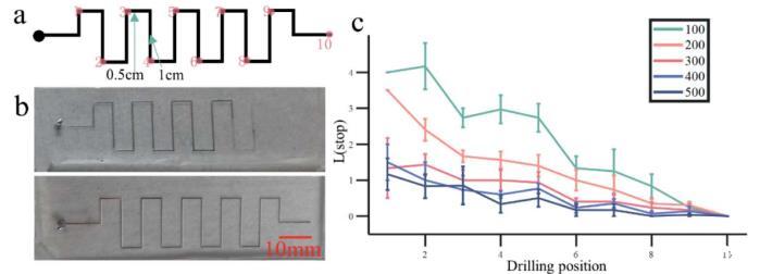 圖4。激光打孔位置實驗過程及結(jié)果。(a)激光打孔位置編號示意圖;(b)2號位置(上圖)和10號位置(下圖)兩個不同鉆孔位置的液態(tài)金屬填充結(jié)果;(c)不同通道寬度下鉆孔位置和液態(tài)金屬充填結(jié)果統(tǒng)計結(jié)果;誤差條表示每個點的標準誤差;圖圖例表示不同通道寬度,單位為mm。