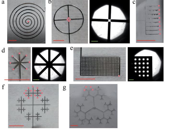 圖5:一些復雜微電極的照片。紅點表示激光打孔在每個子圖中的位置。(a)圓形天線;(b)具有四通道末端的車輪設(shè)計及其詳細光學圖像;(c)細而小的八通道端結(jié)構(gòu)設(shè)計;(d)多分岔設(shè)計及其詳細光學圖像;(e)大面積設(shè)計及其詳細光學圖像;(f)多分支、多終端的復雜渠道設(shè)計;(g)多支細雪狀設(shè)計。紅色標尺代表5mm,綠色標尺代表500mm。