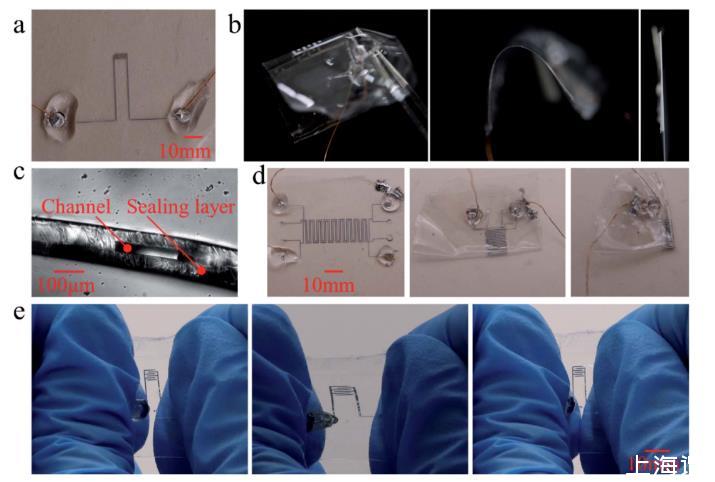圖1制備的微電極及其性能。(a)薄的液態(tài)金屬基柔性微電極;(b)微電極的側(cè)視圖和靈活性(左和中)以及與A4紙的厚度比較(右);(c)在顯微鏡下測量厚度;(d)將柔性微電極折疊兩次;(e)微電極的拉伸性。