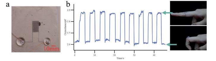 圖6。液態(tài)金屬基柔性微電極作為可穿戴應變傳感器的應用。(a)形狀傳感器的照片;(b)不同手指位置的測量電容。