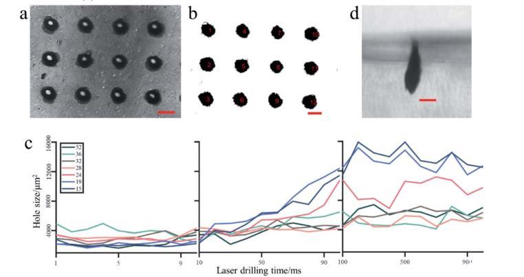圖3 PDMS膜上不同激光打孔次數(shù)的實驗結(jié)果及分析。(a)在顯微鏡下激光打孔的圖案照片;(b)抽取孔和編號孔;(c)不同鉆孔次數(shù)和膜厚度下激光鉆孔尺寸的統(tǒng)計結(jié)果;圖中圖例表示不同PDMS膜厚度,單位為mm;(d)顯微鏡下長時間鉆孔的側(cè)視圖。(a)、(b)和(d)中的比例尺代表5毫米。