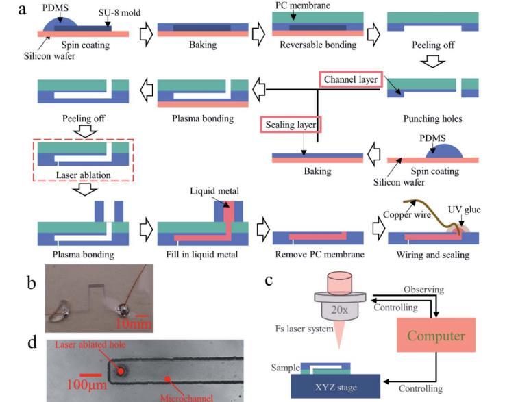在目前的工作中,提出了一種制造高分辨率、薄(119毫米)和盲端液態(tài)金屬微電極的方法。微電極是通過向薄PDMS通道中注入室溫液態(tài)金屬制備的。用于塑造液態(tài)金屬的通道的高分辨率是通過光刻實現(xiàn)的。該薄電極結(jié)構(gòu)是在本實驗室開發(fā)的可逆PC膜鍵合工藝的輔助下開發(fā)的。盡管已經(jīng)報道了幾種制造盲端液態(tài)金屬電極的方法,但整個通道的制造工藝和厚度都是有限的。在這方面,目前的工作涉及使用激光燒蝕技術(shù)在PDMS膜上制造小孔,使制造盲端液態(tài)金屬電極成為可能。所制造的薄液態(tài)金屬電極顯示出高度柔韌性,甚至可以承受數(shù)次折疊。此外,它具有很高的應變承受能力,因此,它在開發(fā)可穿戴傳感器和柔性電子產(chǎn)品方面的潛力在目前的工作中得到了說明。