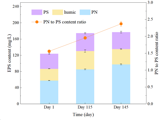 顆粒污泥的形成也有利于AnAOB的富集,顆粒污泥為AnAOB提供了適宜的缺氧微環(huán)境并增強(qiáng)了系統(tǒng)污泥持留能力。系統(tǒng)內(nèi)顆粒污泥的形成與A/O/A交替運(yùn)行模式有關(guān)。這種飽食/饑餓的運(yùn)行方式刺激了EPS的分泌,通過增強(qiáng)微生物之間的聚合作用來促進(jìn)顆粒污泥的形成。系統(tǒng)中EPS含量由初始的123.9±1.5(Day 1)增長到177.0±2.5 mg/L(Day 145),其中蛋白質(zhì)與多糖的比值由1.6±0.0增長到2.4±0.1,這有利于微生物聚集與顆粒污泥的形成。此外,系統(tǒng)中也富集了一些與微生物聚集和附著有關(guān)的菌屬,比如norank_f_SBR1031和Anaerolineaceae,其可能與污泥顆粒化有關(guān)。