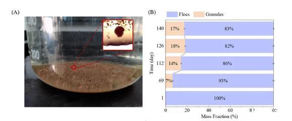 圖2(A)SBR中紅色顆粒污泥的形成,(B)顆粒污泥和絮體污泥質(zhì)量占比的變化