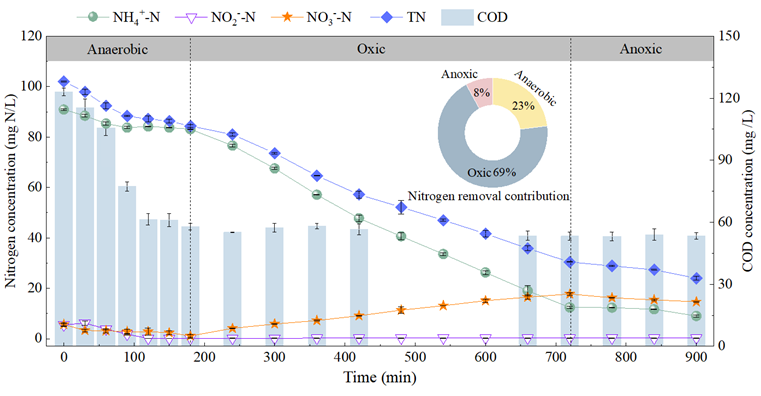 厭氧氨氧化是一項(xiàng)極具前景的生物脫氮工藝,具有污水處理能源自給自足的潛能。目前,大多數(shù)厭氧氨氧化系統(tǒng)的建立需要通過接種厭氧氨氧化污泥實(shí)現(xiàn),然而由于AnAOB生長緩慢,厭氧氨氧化污泥難以大量獲取,限制了該工藝的推廣應(yīng)用。近期有研究發(fā)現(xiàn),AnAOB廣泛存在于污水處理的各個系統(tǒng),并且其對脫氮的貢獻(xiàn)不可忽視,這表明原位富集AnAOB是可行性的。并且,通過合適的運(yùn)行條件,如缺/好氧交替運(yùn)行模式形成的飽食/饑餓條件,可促進(jìn)顆粒污泥的形成,而顆粒污泥也有利于AnAOB的有效持留和富集。因此,推測在傳統(tǒng)的污水處理系統(tǒng)中,如果通過合適的運(yùn)行模式有望培養(yǎng)厭氧氨氧化顆粒污泥,從而實(shí)現(xiàn)AnAOB的原位富集,促進(jìn)厭氧氨氧化工藝的應(yīng)用和推廣。基于此,本研究探究了在傳統(tǒng)硝化-反硝化絮體污泥系統(tǒng)中原位培養(yǎng)厭氧氨氧化顆粒污泥強(qiáng)化污水脫氮的可行性,并分析了相關(guān)機(jī)理。