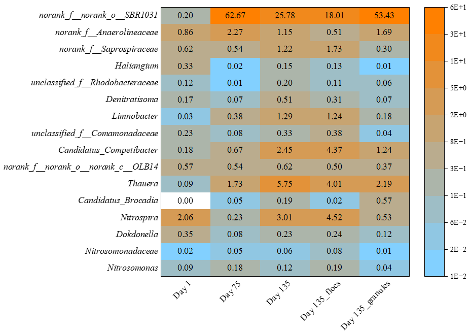 Candidatus Brocadia為優(yōu)勢AnAOB菌屬,其豐度由“未檢出”(Day 1)增加至0.19%(Day 135),其在顆粒污泥中的豐度(0.57%)明顯高于絮體污泥(0.02%),進(jìn)一步證實(shí)系統(tǒng)中成功培養(yǎng)了厭氧氨氧化顆粒。AOB(Nitrosomonas與Nitrosomonadaceae)的豐度由初始的0.11%增長至0.2%左右。相比而言,系統(tǒng)中的優(yōu)勢NOB菌屬Nitrospira的豐度在階段I明顯降低,由2.06%(Day 1)減少至0.23%(Day 135),這有利于促進(jìn)PNA作用。此外,AOB與NOB主要分布在絮體中。隨著系統(tǒng)運(yùn)行,反硝化菌的豐度也明顯增加,如Thauera、Candidatus Competibacter、Limnobacter、Denitratisoma等,其中Thauera與Candidatus Competibacter逐漸成為優(yōu)勢的反硝化菌,在第135天,其豐度分別為5.75%和2.45%,這兩種菌可發(fā)揮短程反硝化作用,從而為AnAOB提供反應(yīng)基質(zhì)NO2--N,并且進(jìn)一步降低出水中的NO3--N,提高脫氮性能。Candidatus Competibacter還能促進(jìn)多糖的分泌,而多糖在加速顆粒污泥的形成和維持顆粒污泥的穩(wěn)定性方面發(fā)揮著重要作用。作為一種典型的絲狀菌,Anaerolineaceae從0.86%增加到1.15-2.27%,它可以作為微生物附著的骨架,促進(jìn)顆粒污泥的形成。此外,norank_f_norank__ SBR1031作為系統(tǒng)中的優(yōu)勢的菌屬,其豐度為18.01-62.67%,該菌屬在厭氧氨氧化系統(tǒng)中廣泛存在,并且在微生物聚集過程中發(fā)揮重要作用,這可能與SBR中顆粒污泥的形成密切相關(guān)。