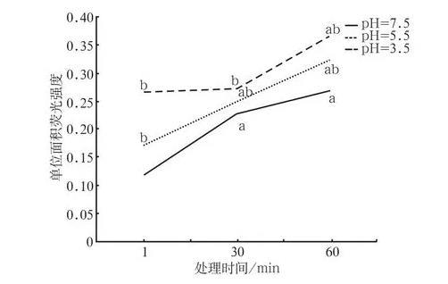 不同pH和處理時間變異鏈球菌低pH感應系統單位面積熒光強度統計圖