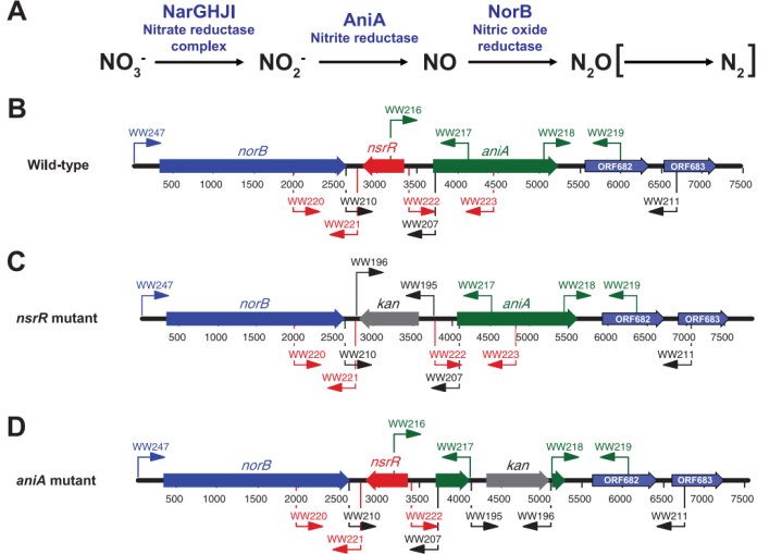 圖1、參與截短脫氮途徑的卡他莫拉菌基因產(chǎn)物示意圖及相關(guān)突變體的構(gòu)建。(A)卡他莫拉菌的截短脫氮途徑包括所示的前三個酶解步驟??ㄋ@然缺乏將N2O還原為N2的能力(用括號表示)。(B至D)包含norB、nsrR和aniA基因的卡他莫拉菌染色體位點示意圖,(B)野生型O35E菌株、(C)O35E nsrR突變體和(D)O35E aniA突變體的側(cè)翼區(qū)域。箭頭表示用于PCR的不同引物的相對位置。