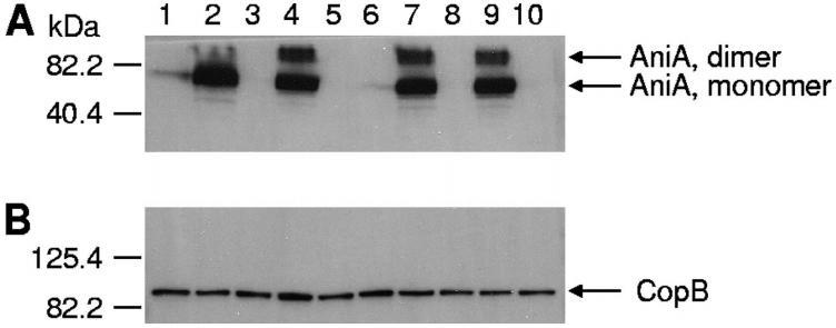 圖3、NsrR對野生型、突變型和互補突變型卡他莫拉菌AniA蛋白表達的影響。用多克隆AniA抗血清(A)或CopB特異性單克隆抗體10F3(B)作為一抗,對菌株的全細胞裂解液進行Western印跡分析。泳道1,野生型菌株O35E;泳道2,O35E nsrR突變體;泳道3,O35E aniA突變體;泳道4,O35E nsrR(pWW115);泳道5,O35E nsrR(pWW150);第6道,野生型ETSU-9;第7道,ETSU-9 nsrR突變體;第8道,ETSU-9 aniA突變體;第9道,ETSU-9 nsrR(pWW115);第10道,ETSU-9 nsrR(pWW150)。推測的AniA單體和二聚體的位置用A組右側(cè)的箭頭表示。CopB外膜蛋白被用作載荷對照,其位置在B組右側(cè)用箭頭表示。分子質(zhì)量標記物的位置在各圖的左側(cè)。