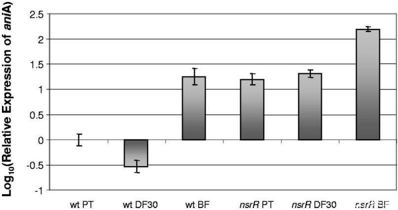圖2通過qRTPCR測定卡他莫拉菌ETSU-9野生型和突變株在不同生長條件下aniA的表達。從野生型ETSU-9(wt)和ETSU-9 nsrR突變體(nsrR)細胞中分離出總RNA,這些細胞在含30μM Desferal(DF30)的肉湯和連續(xù)流生物膜系統(tǒng)(BF)中生長,在鐵限制條件下處于浮游狀態(tài)(PT)。qRTPCR如“材料與方法”中所述進行。