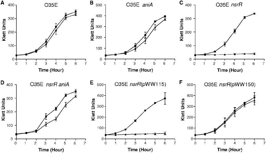 圖4、NO2-對卡他莫拉菌野生型、突變型和互補突變株生長的影響。野生型菌株O35E(A)、O35E aniA突變體(B)、O35E nsrR突變體(C)、O35E nsrR aniA突變體(D)、O35E nsrR(pWW115)(E)和O35E nsrR(pWW150)(F)的細胞在BHI培養(yǎng)基(黑正方形)或含5mM NaNO2的BHI培養(yǎng)基(黑三角形)中生長。大部分數(shù)據(jù)為三個獨立生長實驗的平均值;B組數(shù)據(jù)例外,為兩個獨立實驗的平均值。
