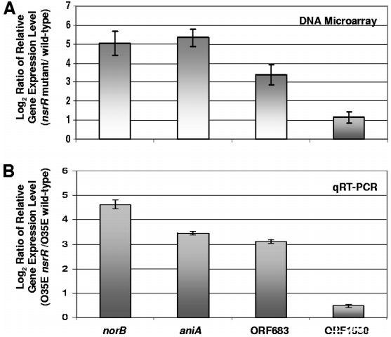 圖5、確定受NsrR調(diào)控的卡他莫拉菌基因。(A)按照材料與方法中的描述,對從野生型菌株O35E、7169和ETSU-9以及這些菌株的nsrR突變體中分離的總RNA進行了DNA微陣列分析。圖中顯示了在所有三個nsrR突變體中持續(xù)上調(diào)至少兩倍(P<0.002)的基因數(shù)據(jù)。誤差條表示標準偏差。(B)qRT-PCR分析norB、aniA、MC ORF 683和MC ORF 1550在菌株O35E的nsrR突變體和野生型細胞中的相對表達水平。qRT-PCR測量的內(nèi)源對照是MC ORF 1234的表達。最大和最小相對表達水平用誤差條表示。