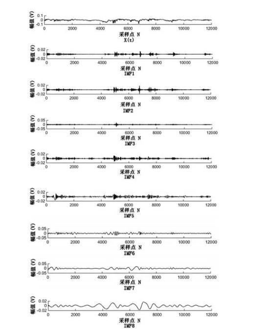即原始信號分解成n個固有模態(IMF)和一個殘余信號rn(t),殘余信號是一個平均的趨勢或是一個常數[11]。所有分量如圖4所示。
