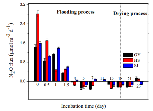 圖4、在三峽大壩彭溪河的水位波動區整個洪水-干燥過程中的N2O排放通量。