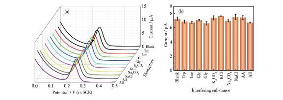圖9以10μmol·L-1尿酸為模型的抗干擾能力:(a)尿酸與不同干擾物共存時的DPV曲線、(b)不同干擾物對尿酸峰電流的影響