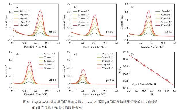 圖6 Cu2O/Cu‐VG微電極的尿酸響應能力:(a~e)在不同pH值尿酸溶液里記錄的DPV曲線和(f)pH值與氧化峰電位的線性關系