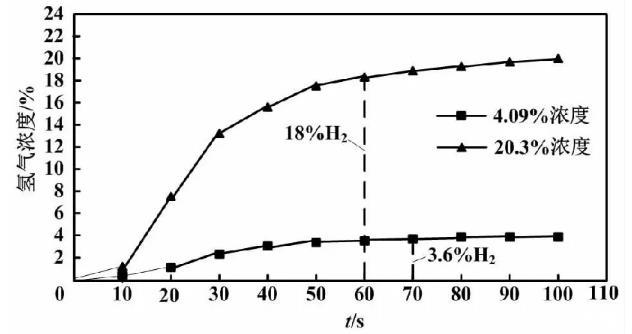 本文在4%和20%標(biāo)準(zhǔn)氫氣濃度下進(jìn)行T90響應(yīng)時間試驗和測量重現(xiàn)性試驗。T90響應(yīng)時間試驗曲線如圖3所示。