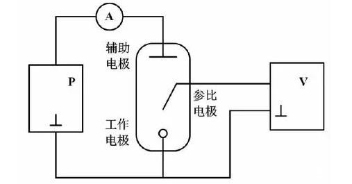 工作電極、輔助電極、極化電源(power,P)和電流表(ammeter,A)構(gòu)成極化回路,為電化學(xué)反應(yīng)產(chǎn)生的自由電子和導(dǎo)電離子提供導(dǎo)電通路,形成與氫氣濃度分壓成比例的極化電流。工作電極、參比電極和電壓表(Voltmeter,V)構(gòu)成測量控制回路,維持參比電極和工作電極電勢差恒定,實現(xiàn)對氫濃度傳感器的恒電位驅(qū)動。參比電極具有已知且穩(wěn)定的電極電位,在測量過程中不發(fā)生電極極化。因此測量控制回路幾乎沒有電流,不會對工作電極的極化狀態(tài)和參比電極的穩(wěn)定性造成干擾。