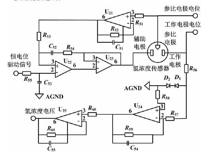 氫氣濃度調(diào)理電路采用低噪聲、低輸入失調(diào)電壓,以及低輸入偏置電流的雙極性運(yùn)算放大器OP-07設(shè)計。為防止傳輸線或空間耦合的高頻振蕩信號造成運(yùn)算放大器U22自激,電阻R54前端串聯(lián)了陶瓷電容C52,用于吸收高頻干擾信號。電阻R56為可變電阻。R56的阻值根據(jù)氫氣濃度監(jiān)測儀和氫濃度傳感器之間的傳輸線上的電阻而定。R56的作用是串聯(lián)電阻R57并與電阻R58構(gòu)成運(yùn)算放大器U24輸入端的平衡電阻。極化電流進(jìn)入運(yùn)算放大器U24反向輸入端,由高精度轉(zhuǎn)換電阻R59將其轉(zhuǎn)換成電壓信號并放大1 000倍。氫氣濃度監(jiān)測儀實時采集參比電極電位和工作電極電位,用于判斷氫濃度傳感器的恒電位驅(qū)動關(guān)系是否失效。