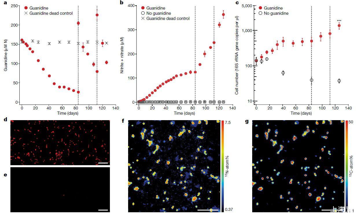 圖3、N.inopinata在以胍為唯一能源、還原劑和氮的情況下生長。a,隨著時間的推移,胍的生物降解。將約50μM(150μM N)同位素標記的胍添加到N.inopinata的洗滌培養物中(與胍和銨預孵育1個月后),并孵育126天。使用高壓滅菌的N.inopinata生物質來控制非生物胍腐爛。在第84天和第112天,將大約50μM的胍額外添加到活生物質培養物中(灰色虛線)。銨從未增加到檢測水平(5μM)以上,尿素濃度保持在2.5μM以下。b、NO 2-和NO 3-產量(組合)。孵育結束時,添加的胍氮總量的78%被氧化為NO 2-和NO 3-。氮平衡顯示在擴展數據圖3f中。c,16S rRNA基因拷貝數的qPCR分析。使用韋爾奇雙樣本t檢驗進行統計分析;***P=0.0049,t=10.348,df=4,比較在126天時間點使用胍與不使用胍孵育的N.inopinata細胞數量。對于a–c,數據是五個生物重復的平均值±標準差。d、e,用胍(d)和不含胍(e)孵育107天后DAPI染色的N.inopinata細胞(紅色,10 ml培養物過濾到0.2μm GTTP過濾器上)的代表性圖像。所有五個生物復制都觀察到相同的結果。f,g,N.inopinata細胞與15 N-胍和13 C-碳酸氫鹽孵育107天后的氮(f)和相應的碳(g)同位素富集(使用nanoSIMS測量)。通過用來自頂空空氣的CO 2稀釋13 C-碳酸氫鹽、丙酮酸鹽形成CO2以及介質中同位素未標記的胍的分解來降低13 C-富集。顯示了來自一個生物復制的數據。