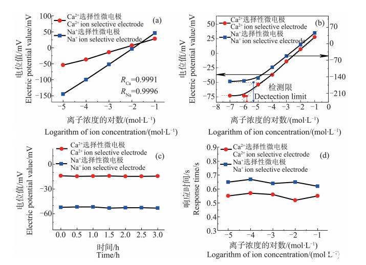 離子選擇性微電極在使用之前需對其進行性能檢測,從線性范圍、檢測下限、響應時間和穩定性4個方面對所制備的Ca2+、Na+選擇性微電極進行了表征,如圖1所示。