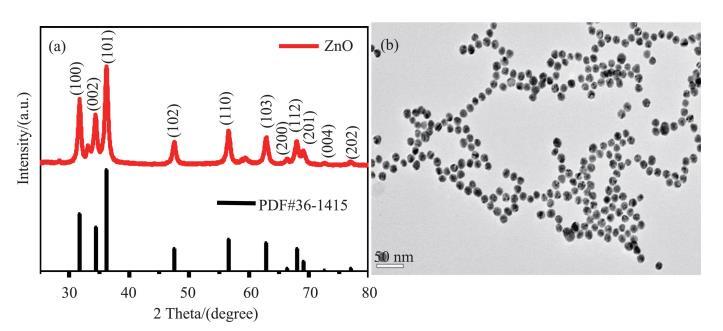 圖2(a)、(b)分別為ZnO NPs(Sigma Aldrich)的XRD譜和TEM圖。在圖2(a)中,經與PDF#36-1415卡片對照后,發現測試譜中的所有衍射峰與標準譜完全一致,說明該物質為六角纖鋅礦型ZnO,未見其他雜相存在。由圖2(b)可以看出ZnO NPs形狀呈球形,形貌均勻,平均直徑約為20 nm。