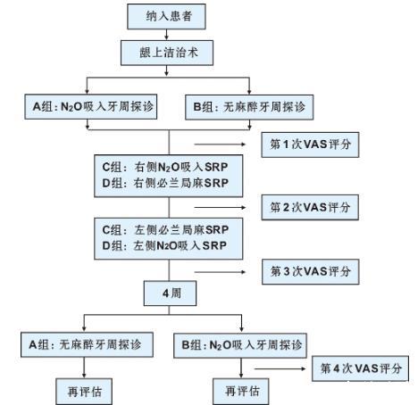 在SRP治療階段,實施雙側分區治療。將納入患者隨機分為2組:C組第一次SRP治療為右側半口區域,在50%一氧化二氮+50%氧氣吸入麻醉下使用超聲齦下刮治器(EMS,瑞士)及手動Gracy齦下刮治器(Hu-Friedy,美國)進行齦下刮治根面平整;D組第一次SRP治療為右側半口區域,在齦頰溝處局部浸潤麻醉下(必蘭,法國)使用超聲齦下刮治器(EMS,瑞士)及Gracy齦下刮治器(Hu-Friedy,美國)進行。第二次SRP治療,C組左側半口區域實施齦頰溝局部浸潤麻醉下SRP;D組左側半口區域實施50%一氧化二氮+50%氧氣吸入麻醉下齦下SRP。治療全程使用心電監護儀記錄實時血壓狀況。