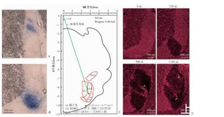 用異氟烷麻醉大鼠后,將大鼠固定于腦立體定位儀。頭部剃毛,從大鼠頭部中縫處剪開皮膚,暴露術野。參照Wistar大鼠腦立體定位MRI圖譜,以Bregma為坐標原點,在其前后徑(anterior-posterior,AP):-9.86 mm;內外徑(medial-lateral,ML):2.75、2.85、2.95、3.05、3.25 mm處的顱骨表面鉆1個小孔,使玻璃微電極垂直進針8.50 mm,停留1 min后以250 nL/min的速度注射20 nL藍墨水,注射完成后留針5 min,緩慢升起電極。縫合頭皮創口并消毒,取下動物待其恢復清醒后放回飼養籠。